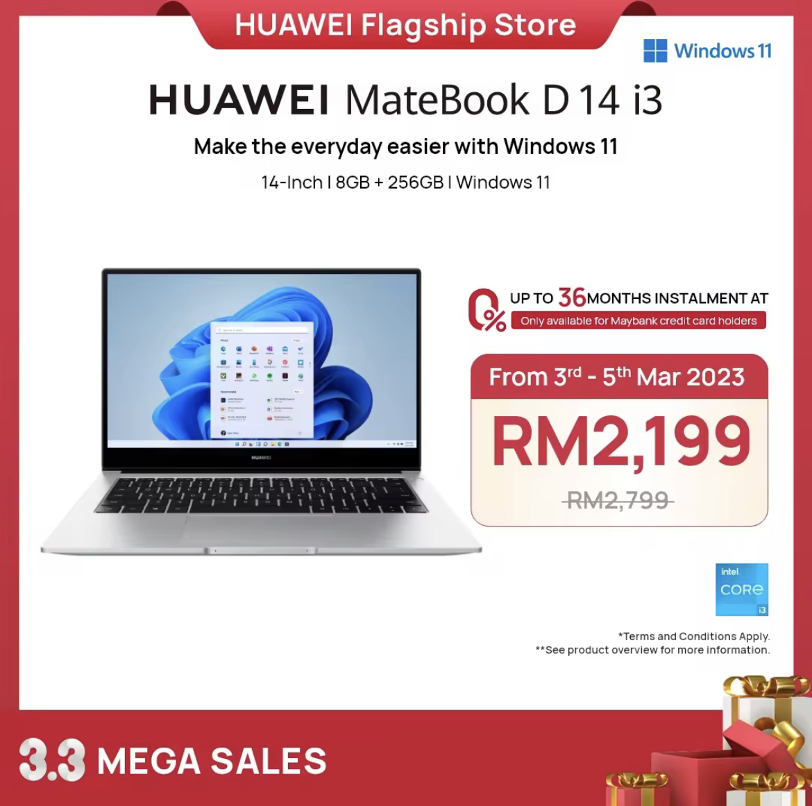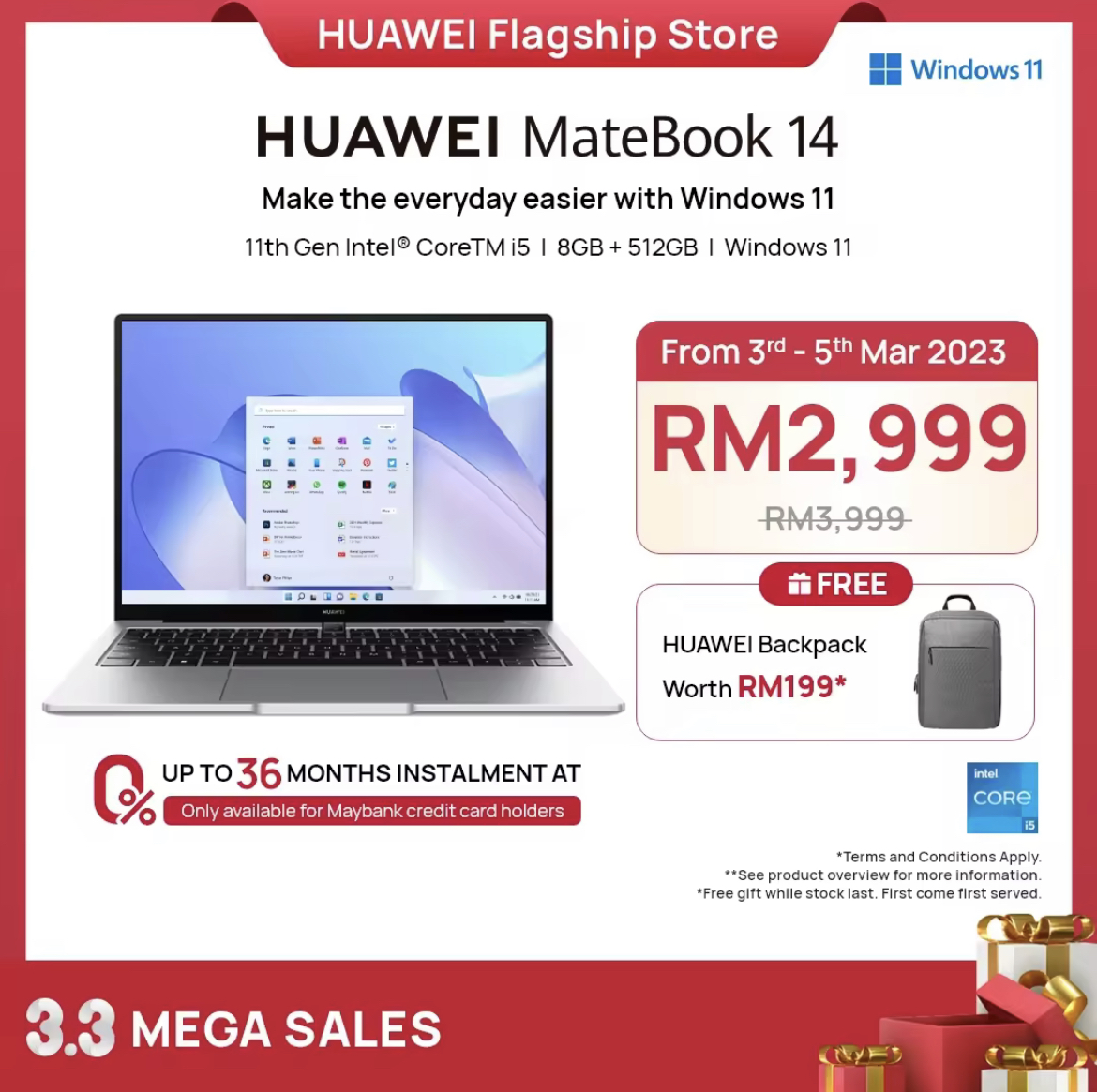 ▼ ③ HUAWEI MateBook 14 i5 2021 Laptop – 附送电脑包 (价值RM199)