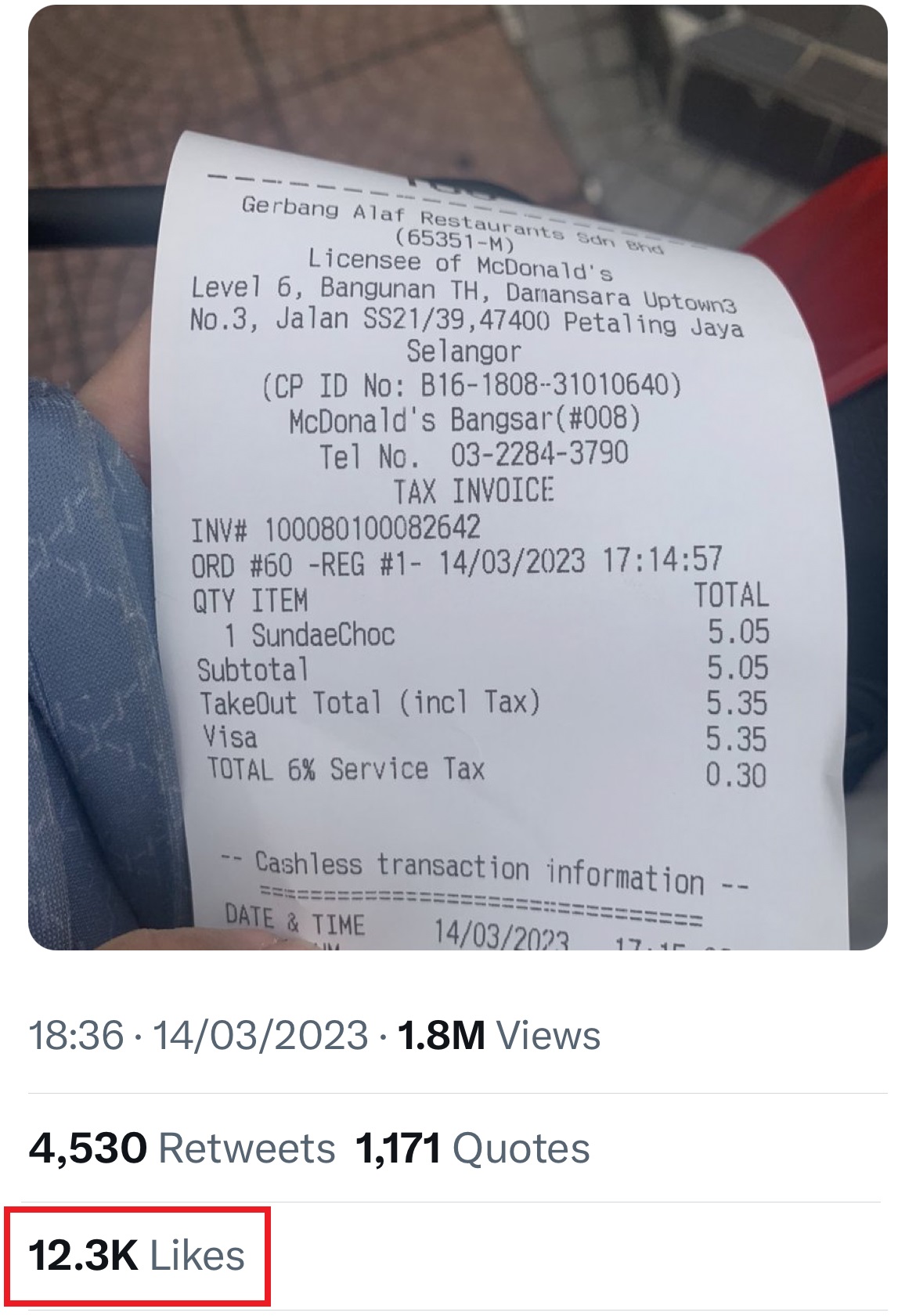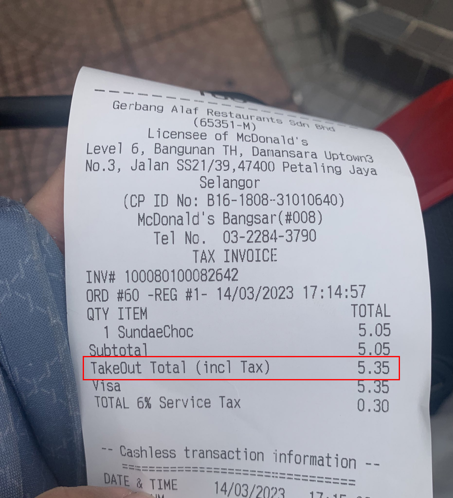 照片是3月14日当天贴主购买 Sundae Chocolate 冰淇淋的单据,上面标记着一杯要价RM5.35。