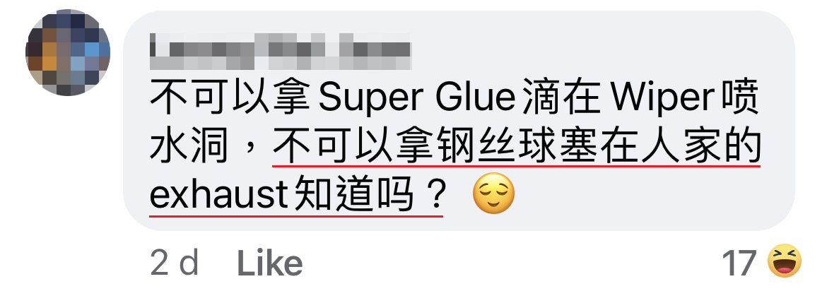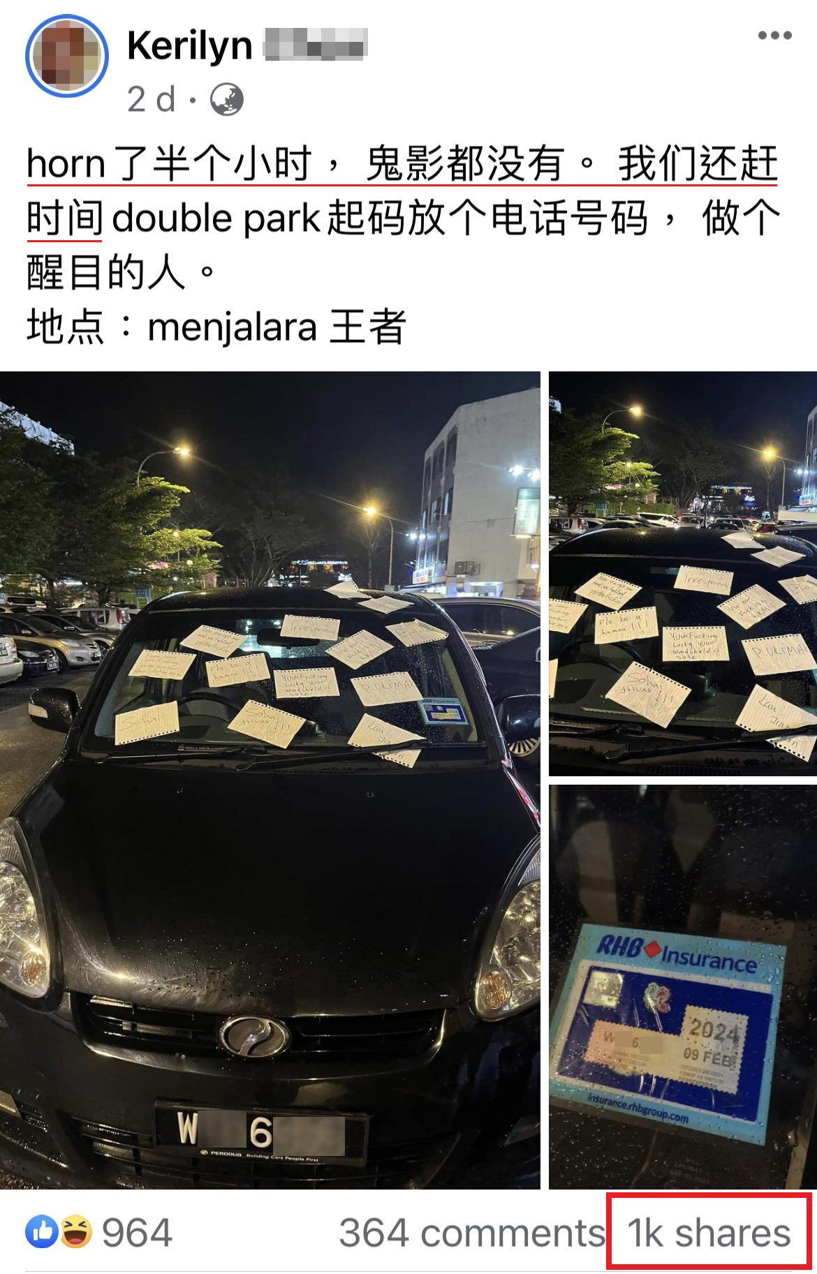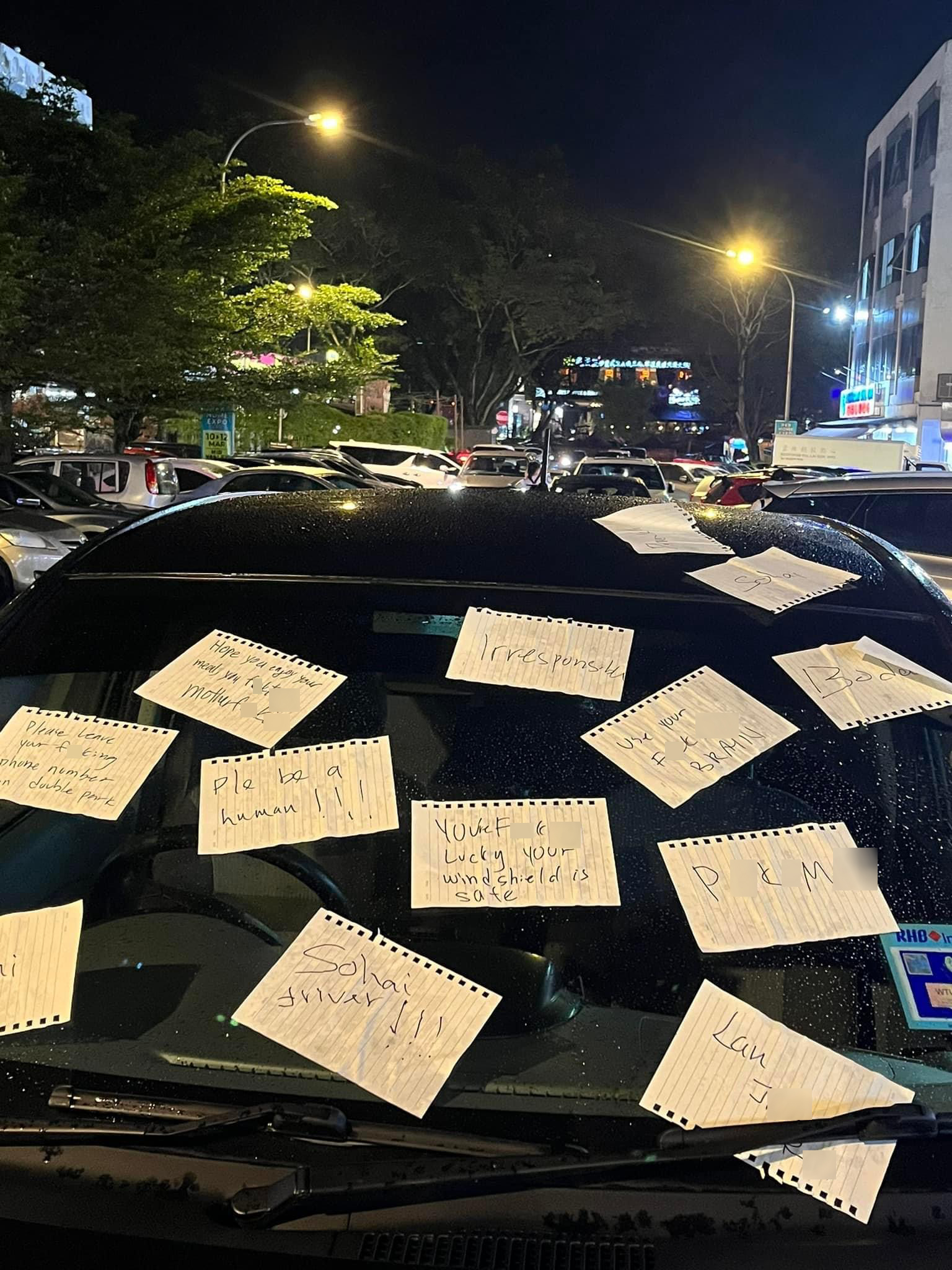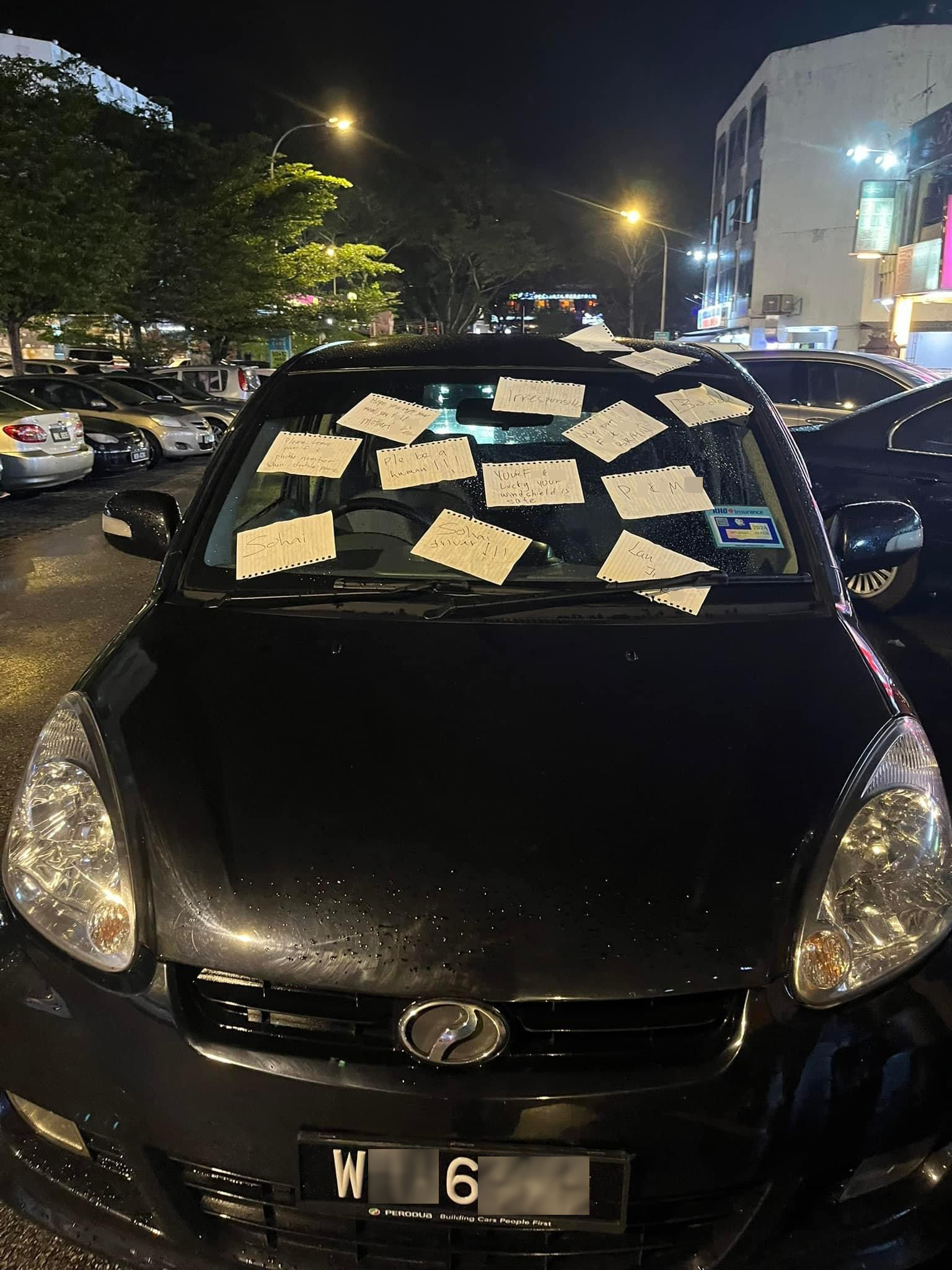事主拿出纸跟笔,写多张留言纸条,贴满 Myvi 的挡风玻璃。每一张都在宣泄她的愤怒:“你很幸运,你的挡风玻璃还平安无事!” “不负责任!” “请你做个人!” 还有一些是爆粗话破口大骂。