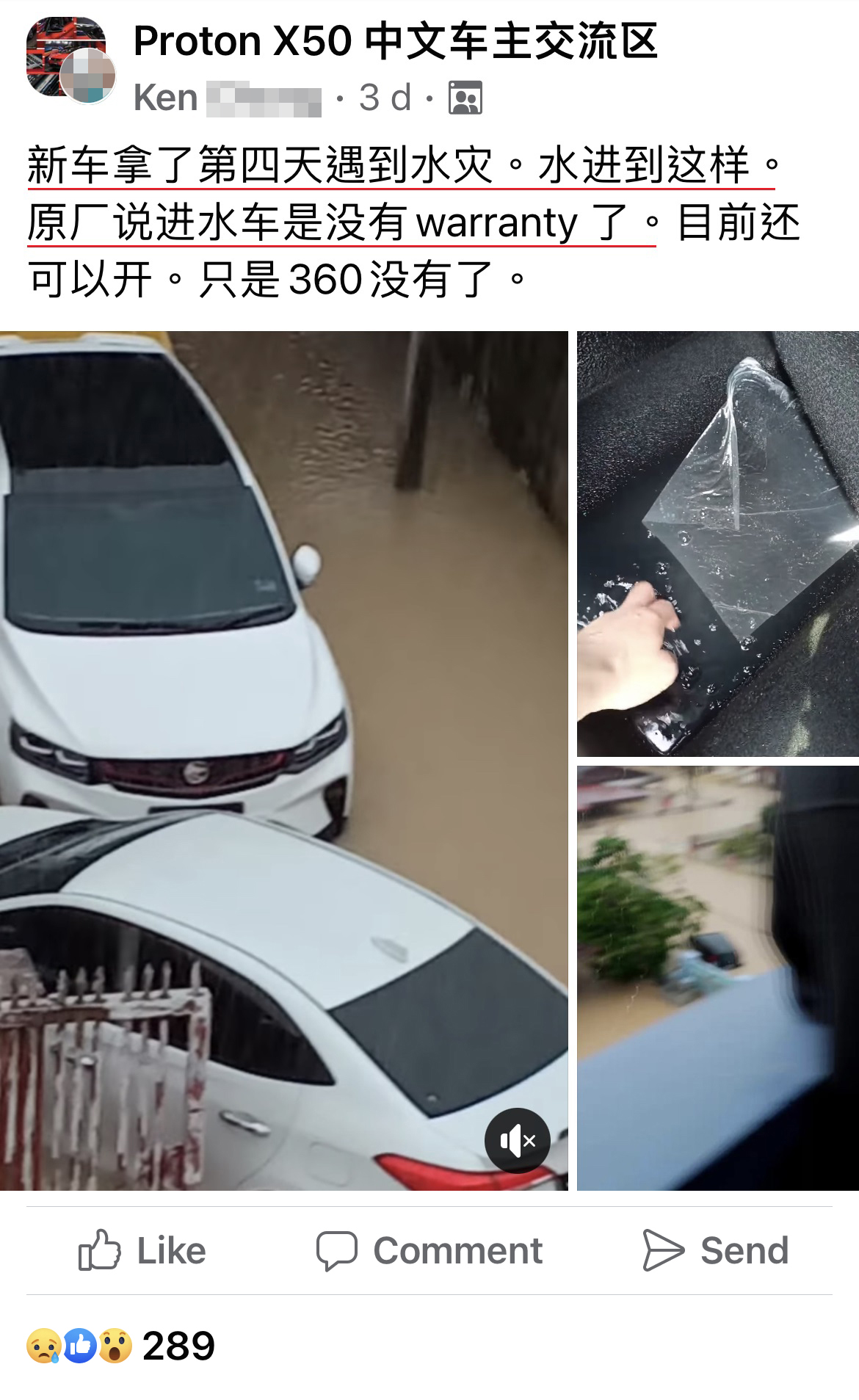 一名大马男子日前在脸书群PO文,买了 Proton X50 好不容易拿到车,结果4天后就遇上水灾,新车变“水车”!