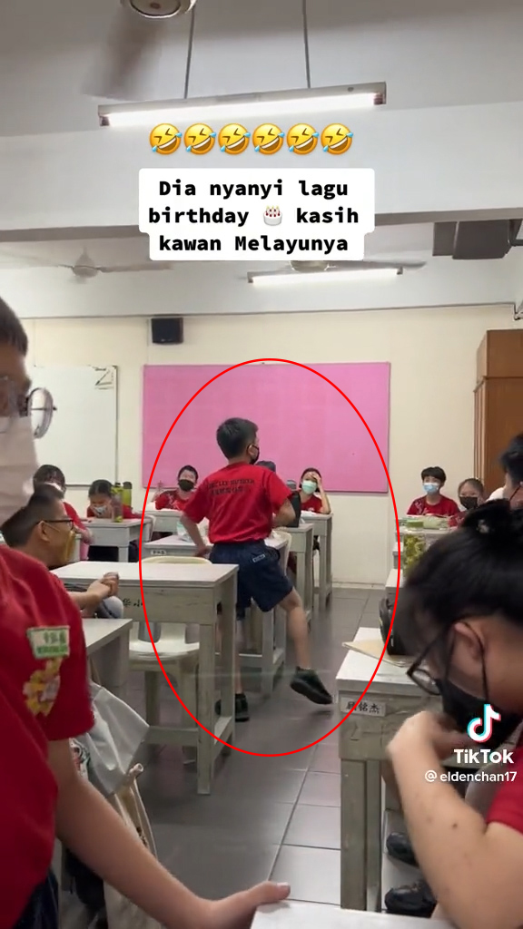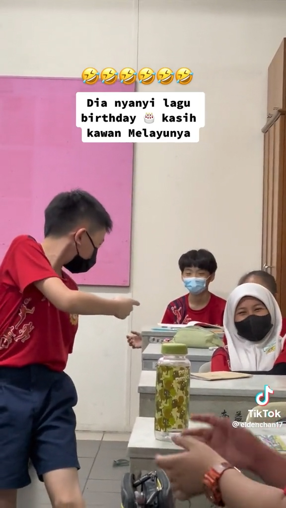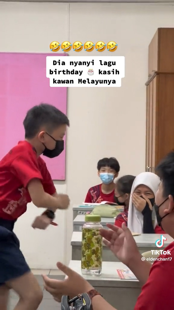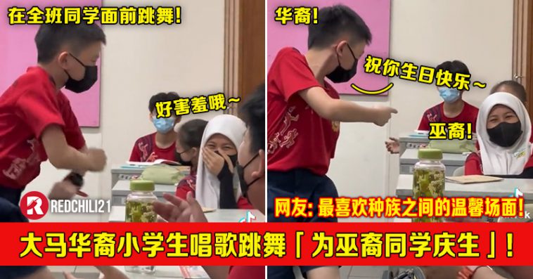 ▼ 事发地点是在大马一所华小,当天刚好是一位巫裔女学生的生日,班上同学全体一起为她唱中文的生日歌,其中一位男同学还热情地为她献舞呢!
