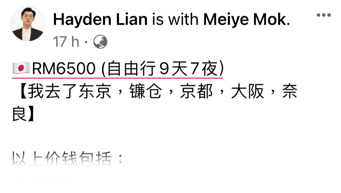 该帖文在网上迅速爆红,不到1天内就累计将近10,000次分享!9天7夜的日本之旅,总花费才RM6500很值得!