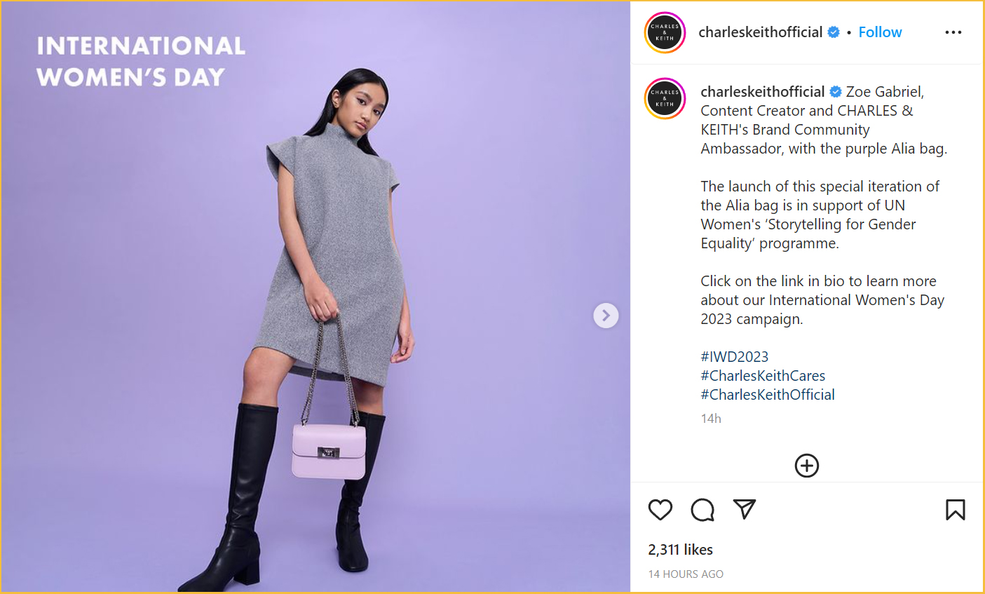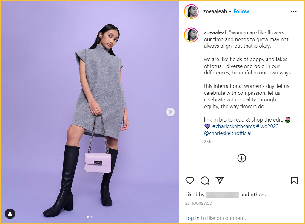 Zoe 昨天(3月4日)在个人 Instagram 账号发帖宣布,自己成为 Charles & Keith 公司2023年国际妇女节活动的模特儿之一!