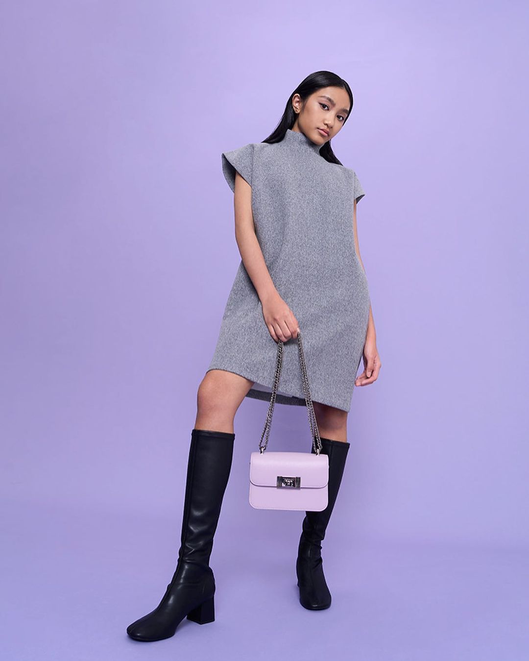 ▼ 照片中的她拿着 Charles & Keith 最畅销的手提袋之一,紫色Alia链带式斜挎包。