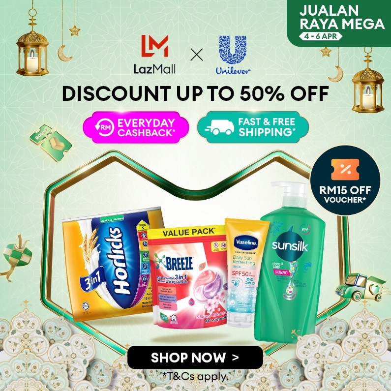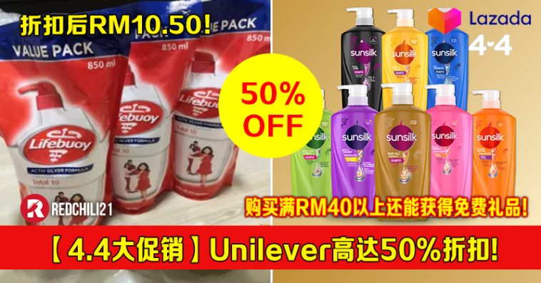 Unilever 将在 Lazada 购物平台的官方店铺举办3天4.4大促销,商品折扣高达50%!