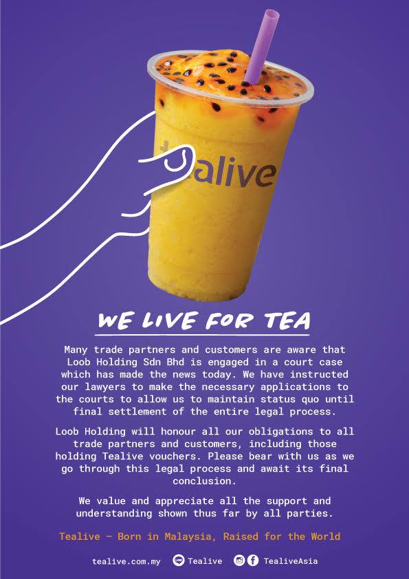 据以上的裁决,也意味着LOOB Holding私人有限公司旗下的Tealive品牌将无法继续营业,Tealive目前在全国拥有161间分店及800名员工。