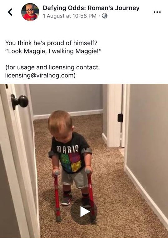 8月1日的时候,其母亲,惠特尼在脸书上分享了她儿子9秒钟的片段,以便其他人可以看到罗曼激动的脸,听到他高兴的笑声,因为他自豪地告诉他的宠物狗他现正在走路。
