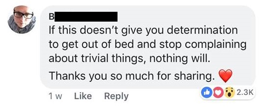▼“如果这不能让你决定起床并停止抱怨琐碎的事情, 相信没有其他事情能启发你了。非常感谢你的分享”。