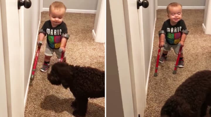视频中罗曼拄着拐杖行走后兴奋地告诉他的狗(Maggie) 看着他并说道:“看着我,我正在走路!”