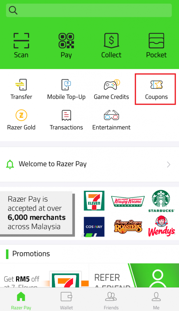 ▼Step 1: 打开“Razer Pay”应用程式然后点击“Coupons”