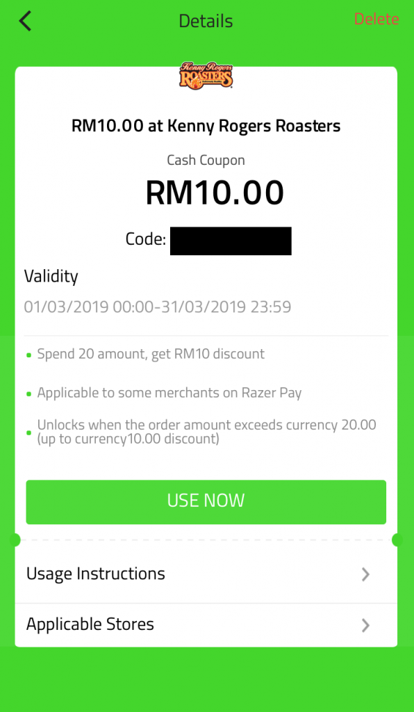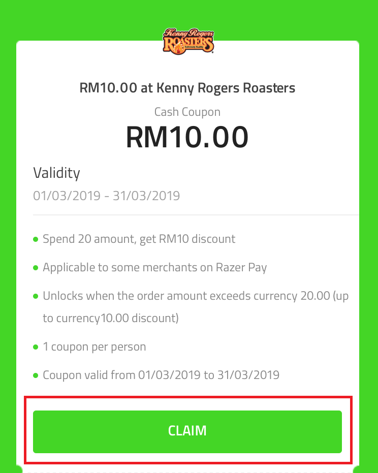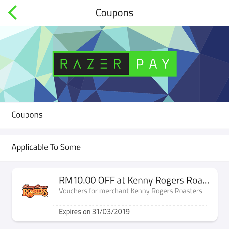 续Razer Pay送出7-Eleven的RM5现金折扣券后,现在又来派送价值RM10的Kenny Rogers Roasters现金折扣券!