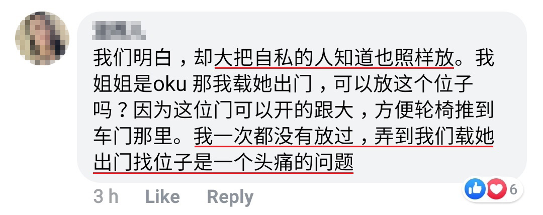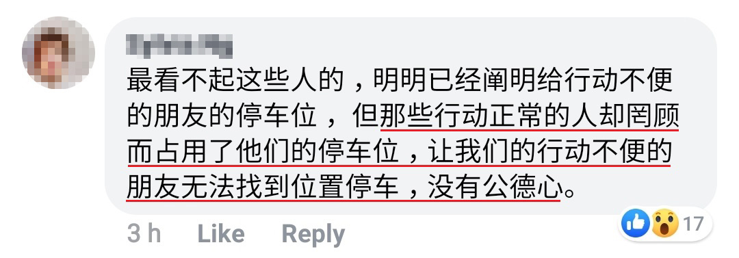 针对此事,Ali 随后已经向该购物商场的管理处投诉。同时 Ali 也表示:希望大家对于残障人士的停车位都能够体谅与明白,不要随意把车子停在这些停车位以造成他人的困扰。