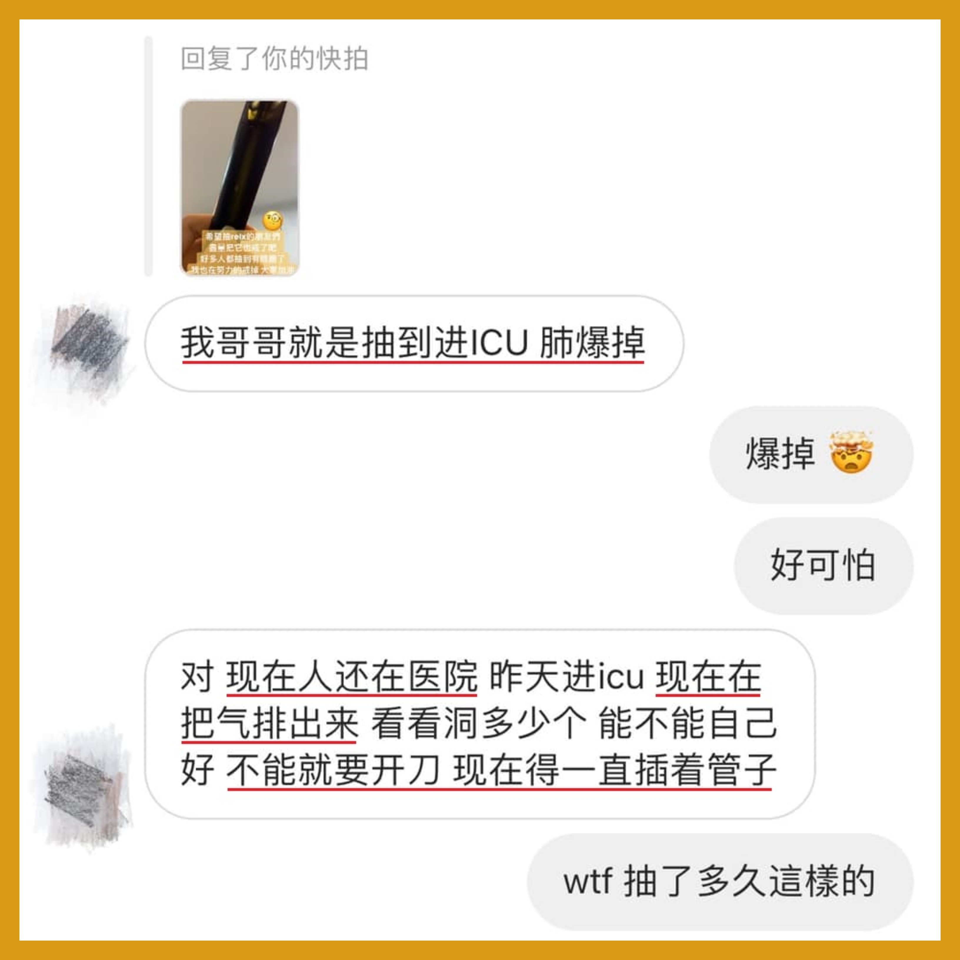你或许会认为:这只是发生在遥远的美国,少数例子而已。但日前有几位大马网友就分享了真实的经历,有男子甚至因而爆肺,躺在医院的加护病房(ICU)里!