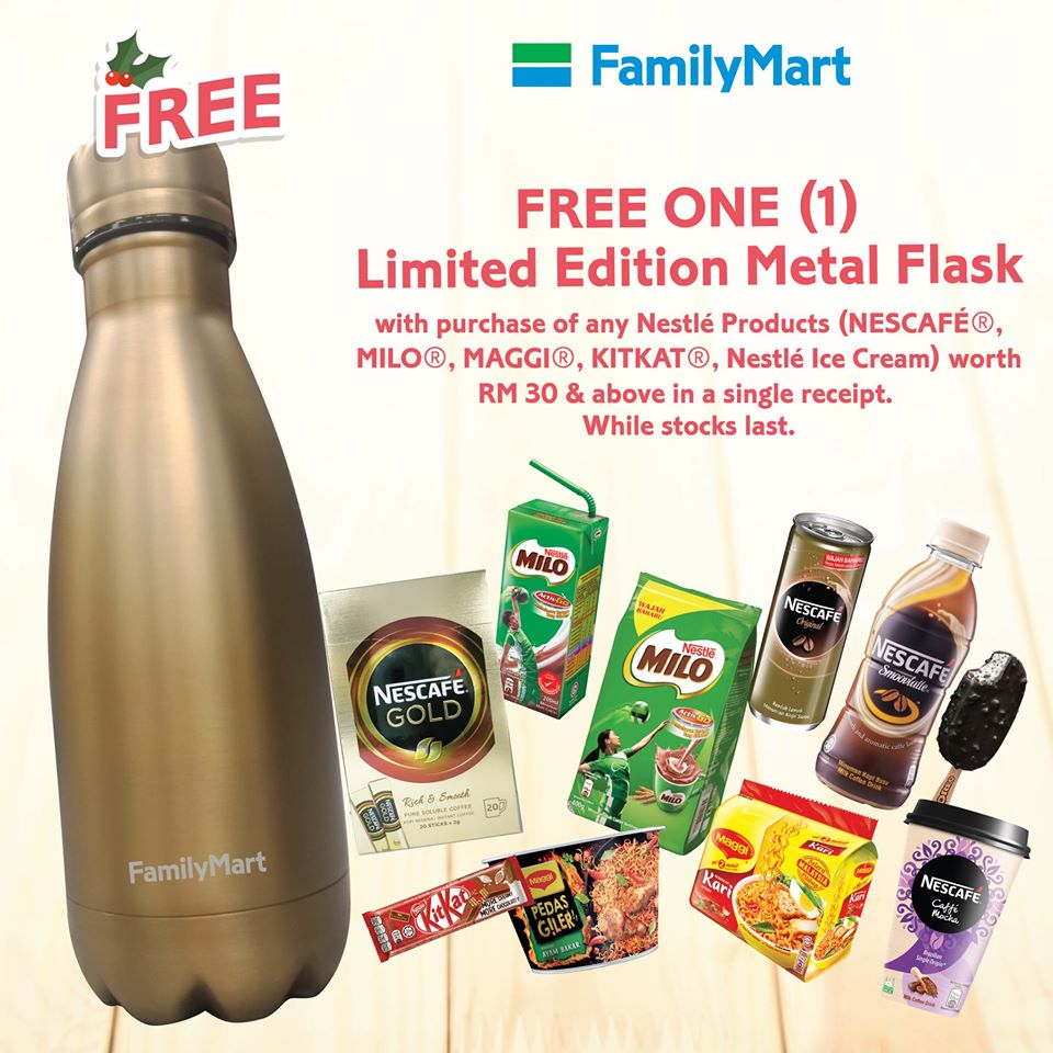 只要亲临 FamilyMart 分行,并购买 Nestle 产品满 RM30 ,就可免费获得一个限量版的金属水瓶!