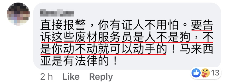 可他却以粗口来对我一番教训。他往我身上踹的那一脚,被我的厨师清楚看在眼里,所以我的厨师很生气的问了一句:「你是要做什么鬼?」可能我的厨师看起来很凶、很生气(毕竟有3位猛男),他直接转身带他的家人去隔壁。