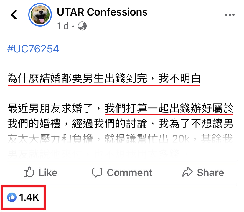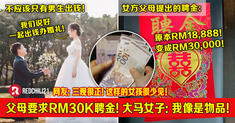 近日一名大马准新娘投稿PO文,叙述自己和男友筹备婚礼的过程。当女方的父母得知女儿要帮忙出钱办婚礼,就表示反对,甚至把原本要求的 RM18,888 聘金改为 RM30,000,让她感到十分不解:「搞到好像我是物品,拿来卖这样!」