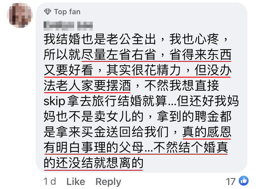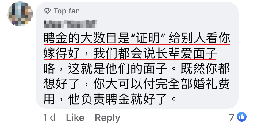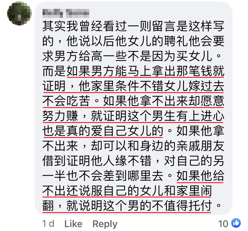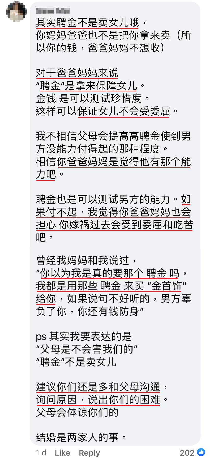 我真的不明白咯,搞到好像我是物品,拿来卖这样。传统”嫁”和”娶”,还有人在用… 如果我父母需要用钱也可以直接跟我拿,不需要透过聘金啦…