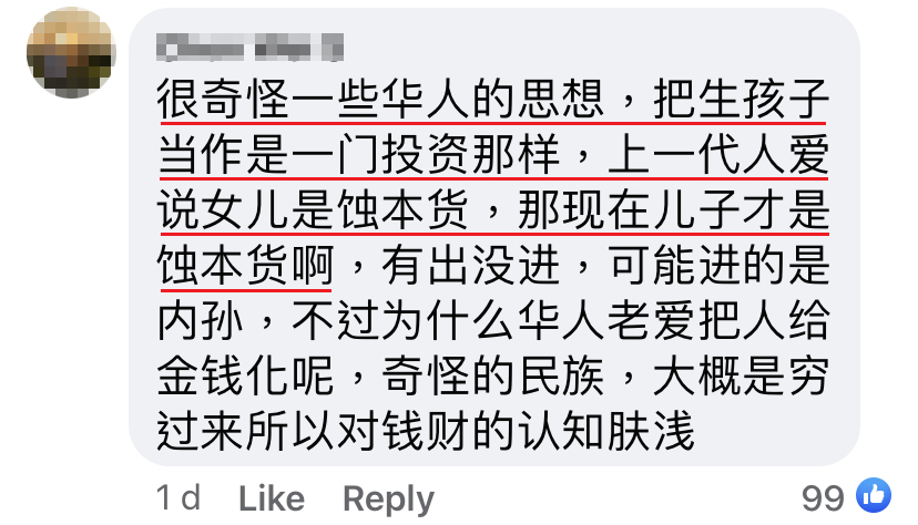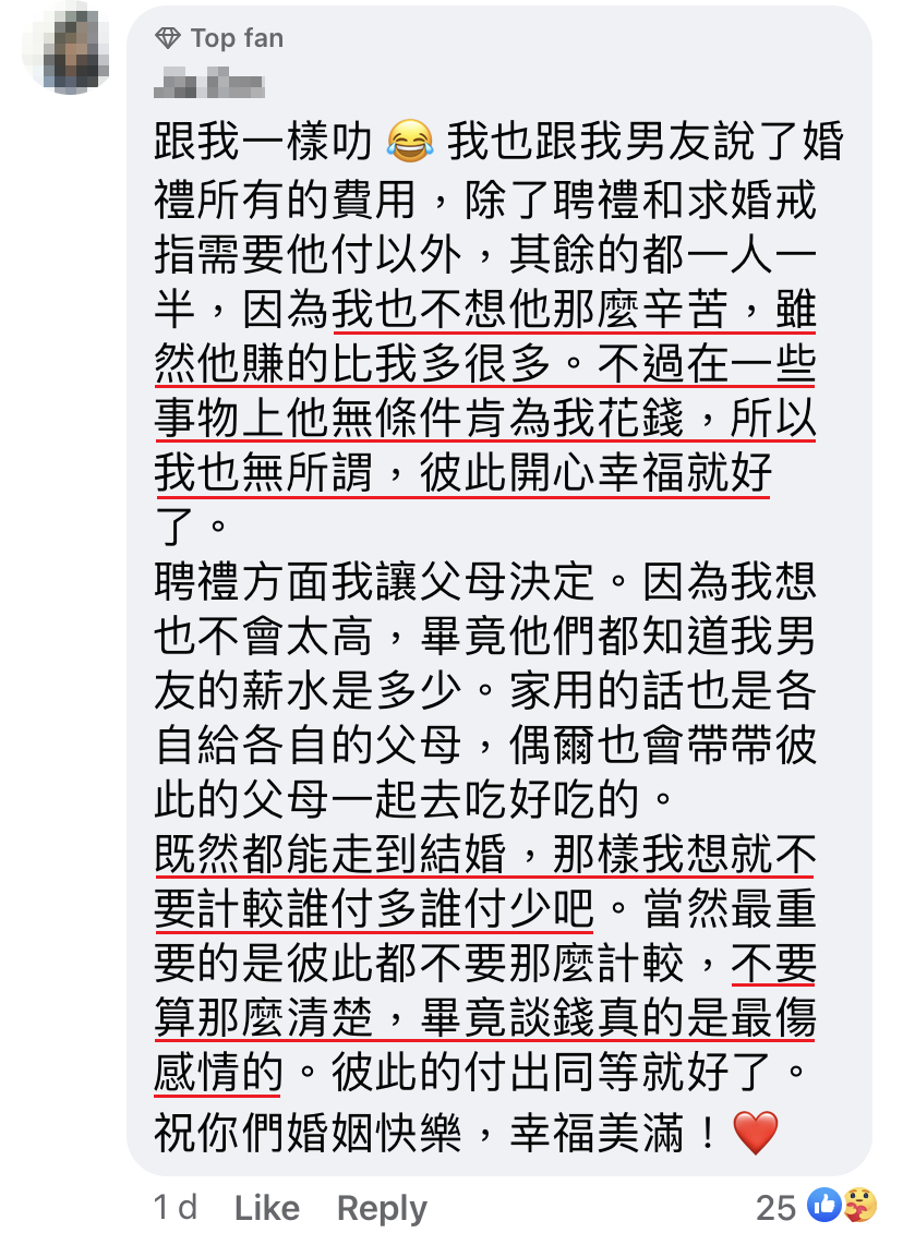 结婚后我们也会搬出去住,不会和家人住(少一点摩擦)。很多人会说,父母养我这样多年,这是男友应该给的,因为男友把我从父母身边带走了。可是我男友父母也养他很多年啊,我也是从他父母身边带走他啊,那我要不要给他父母 RM30K的聘金?
