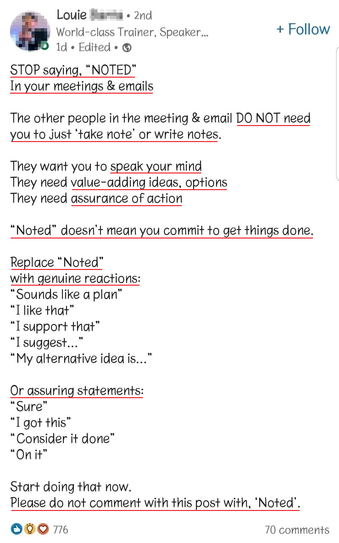 开会或回复邮件的时候,请不要再说“NOTED”。