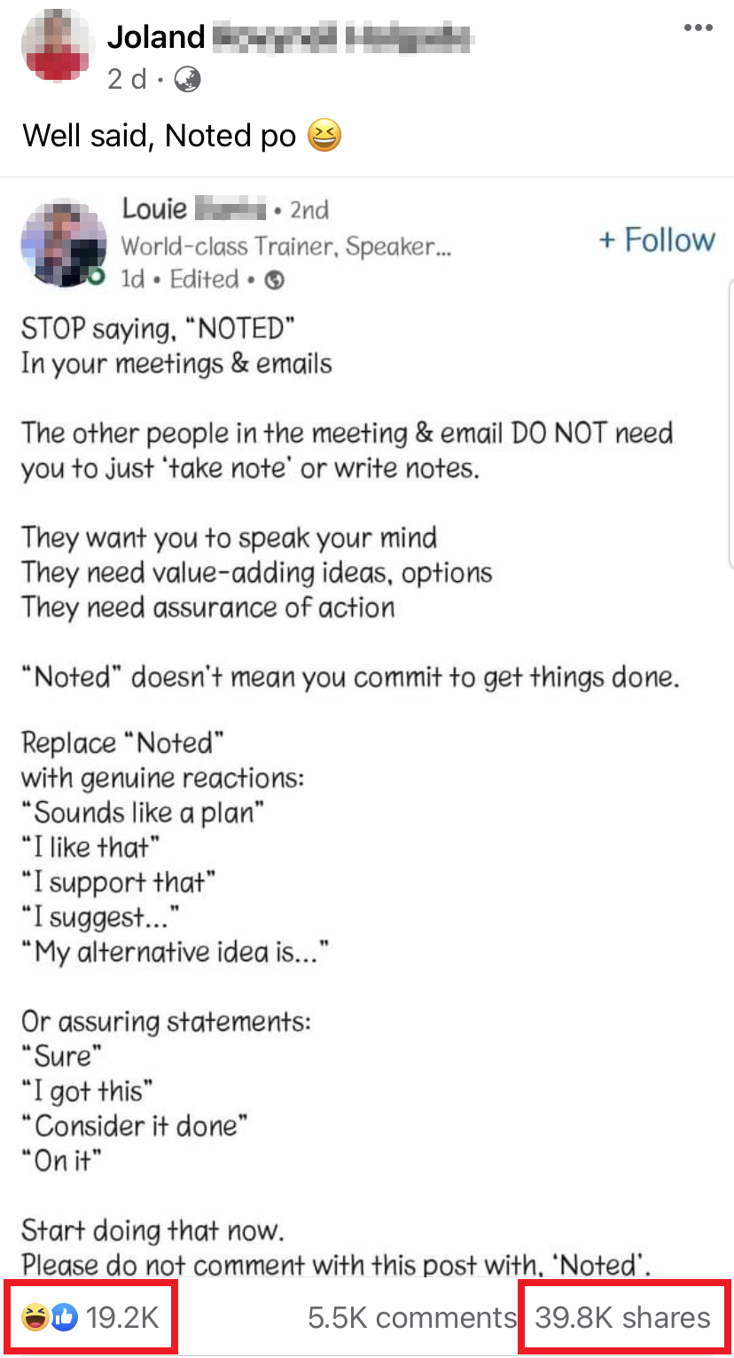 近日一则脸书帖子在网上疯传,菲律宾网友分享一段某位国外演讲员针对“Noted”的言论,该帖子在短短2天内就累计近40,000次分享!