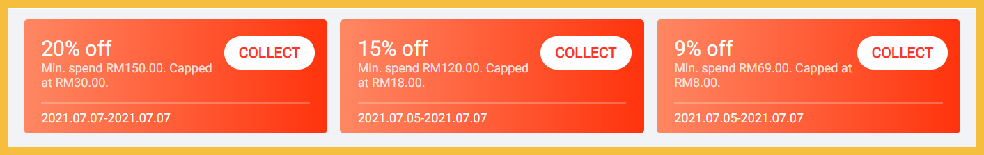 - 消费RM120 可获得15% 折扣(高达RM18 折扣)