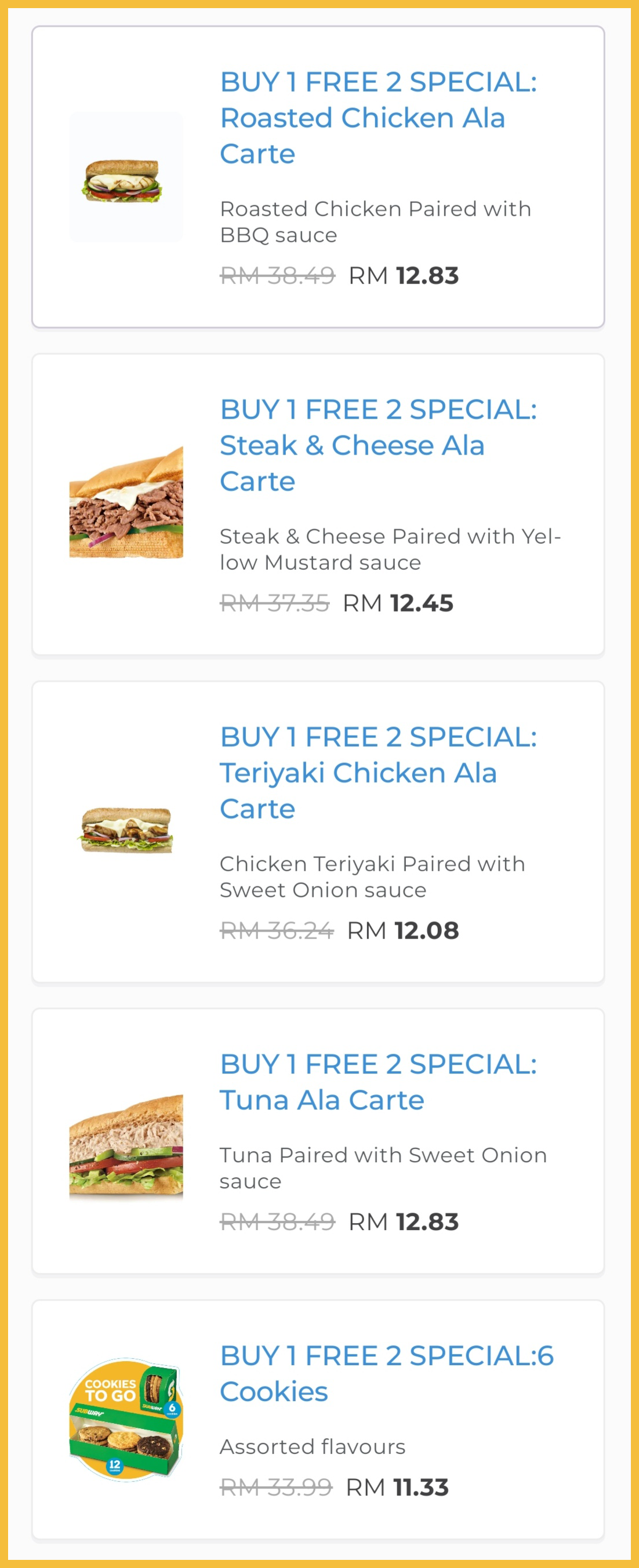 - 三明治买1送2:Teriyaki Chicken Ala Carte – RM12.08(平均一份RM4.03)