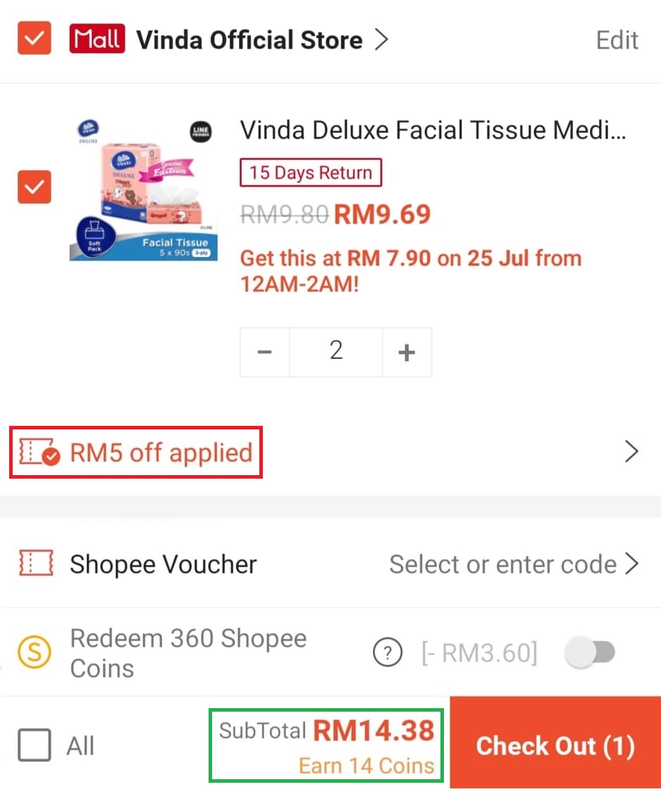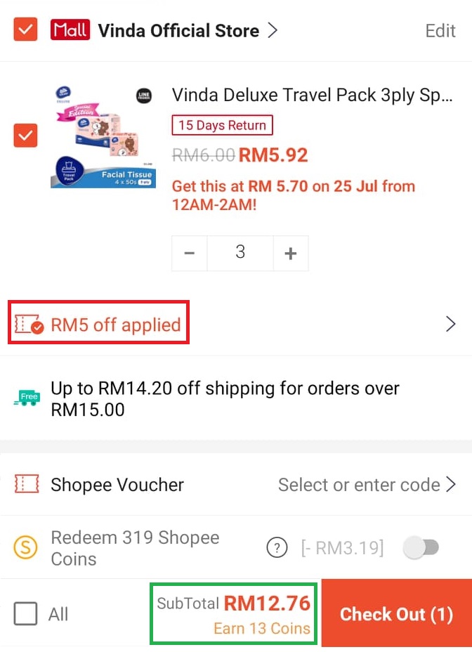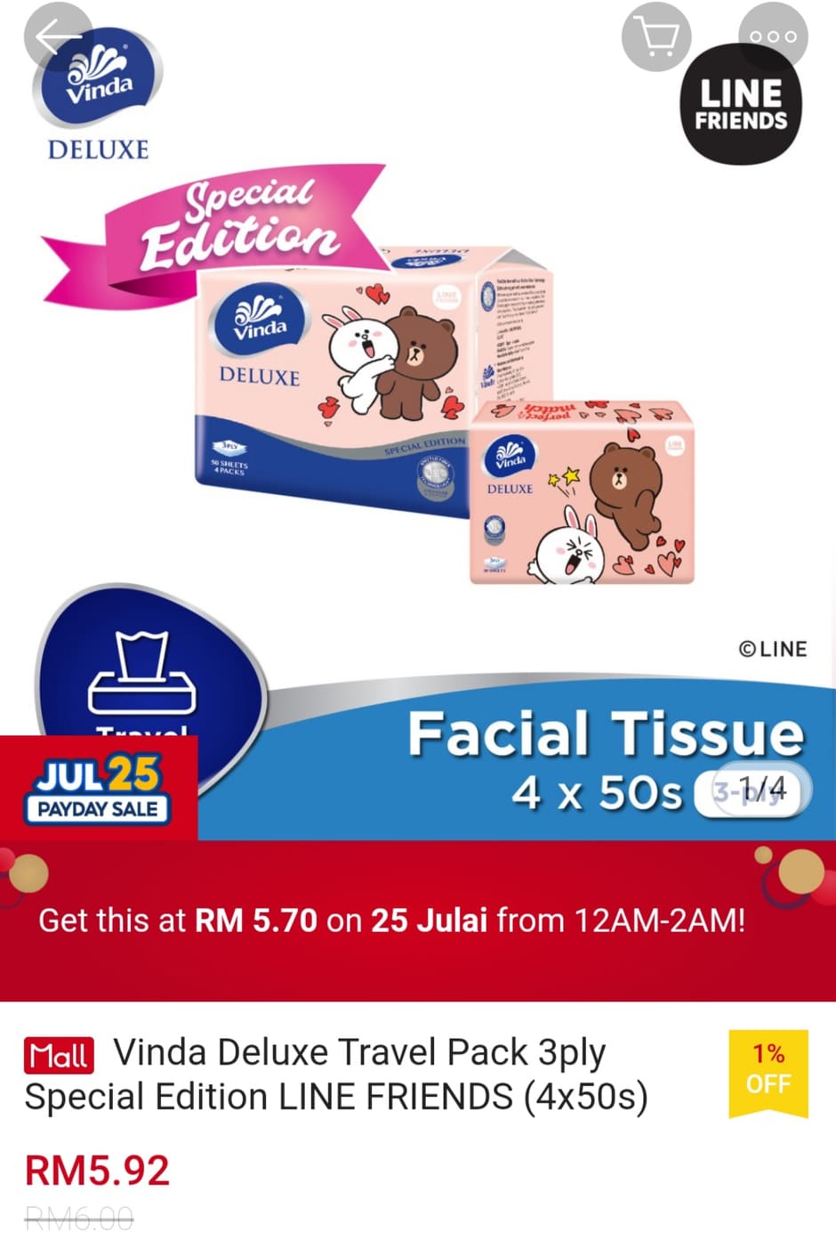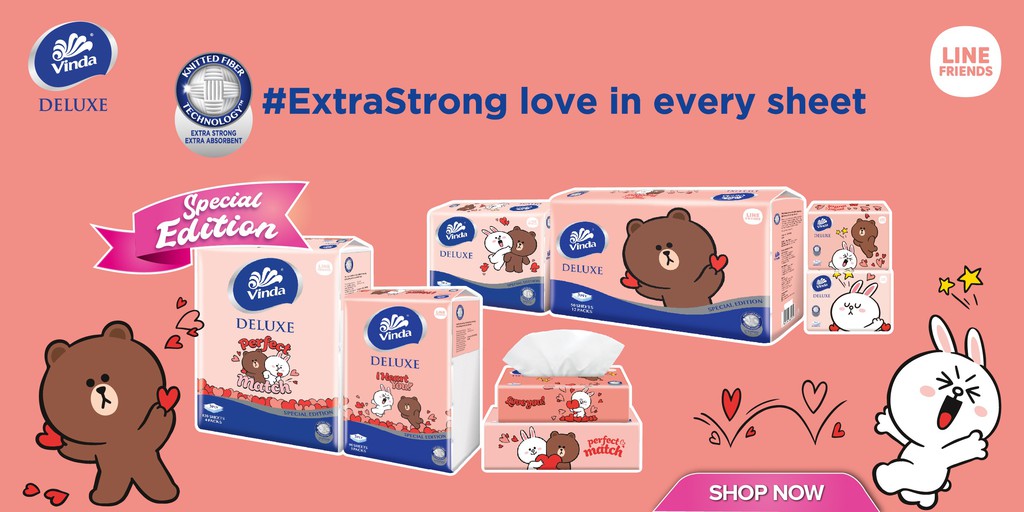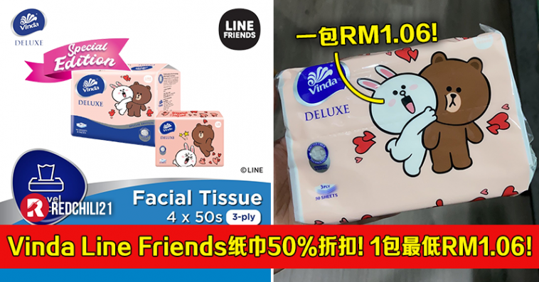 只要你通过Shopee Mum’s Club 会员日这天购买Vinda Line Friends 纸巾可享有50% 折扣!