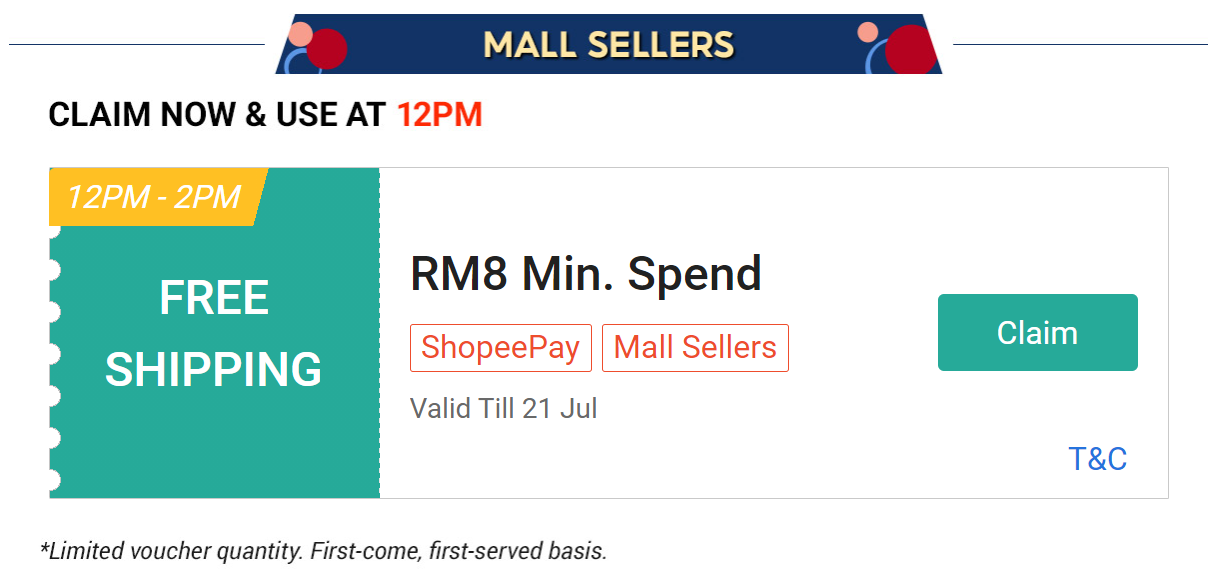 ② 领取Shopee 最低消费RM8 的免邮券!(注意:这张免邮券仅限Mall Sellers)
