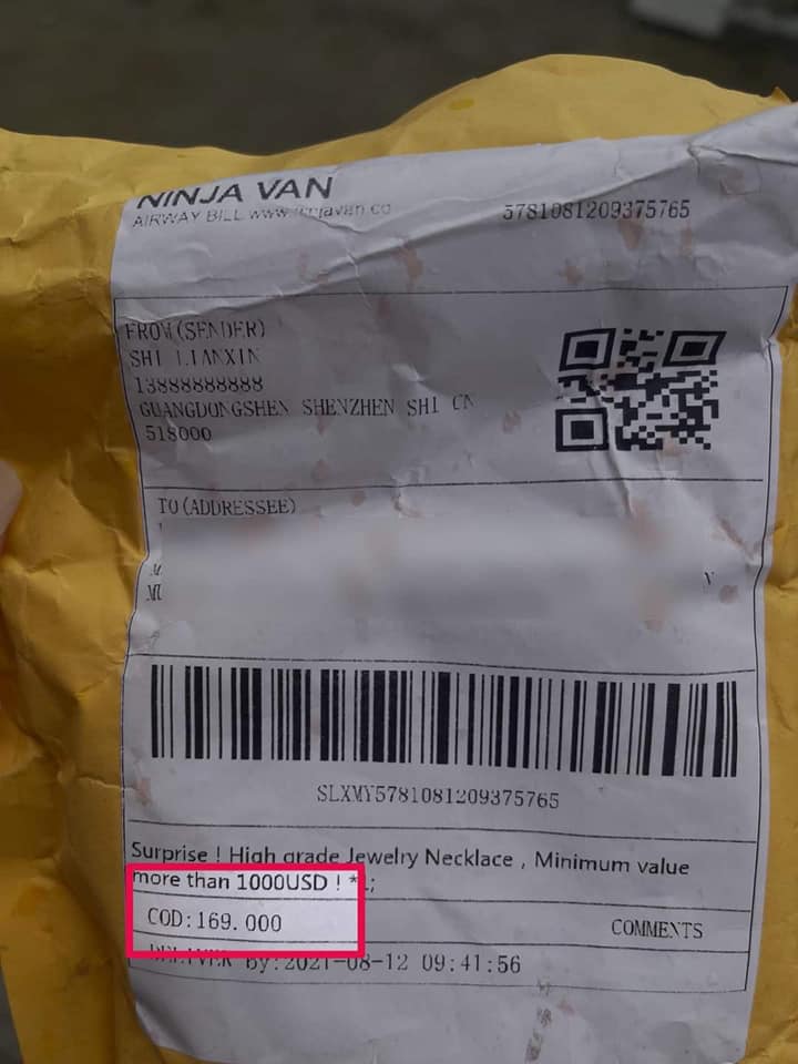 门铃响起,Ninja Van 的 abang 拿着一个小包裹喊着我的full name,说这个包裹要收RM169。我想了一下,我最近没有在网购,就算有也是直接 online 转账付款,而且绝对不是给我的 full name as IC 的为收件人。