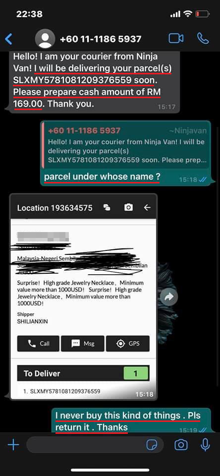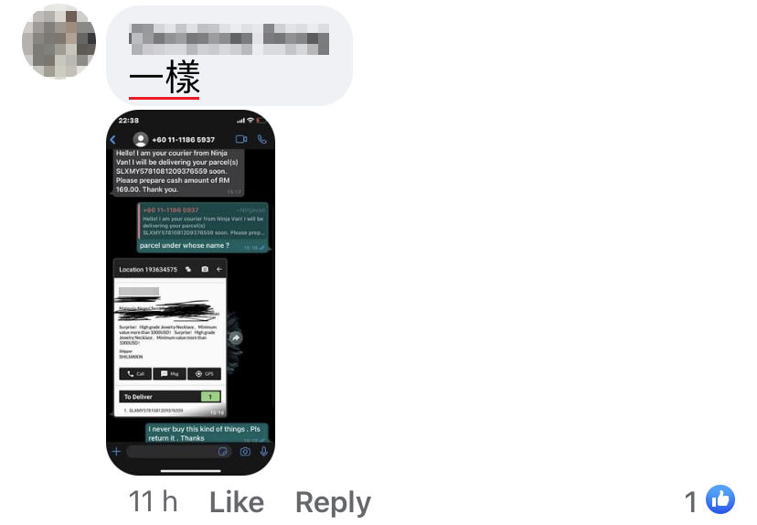 感谢遇到好心的 abang,帮我拿回去退了。但如果他没提醒,我也不会给RM169去签收,因为我没有购买这东西,也不可能给 full name。