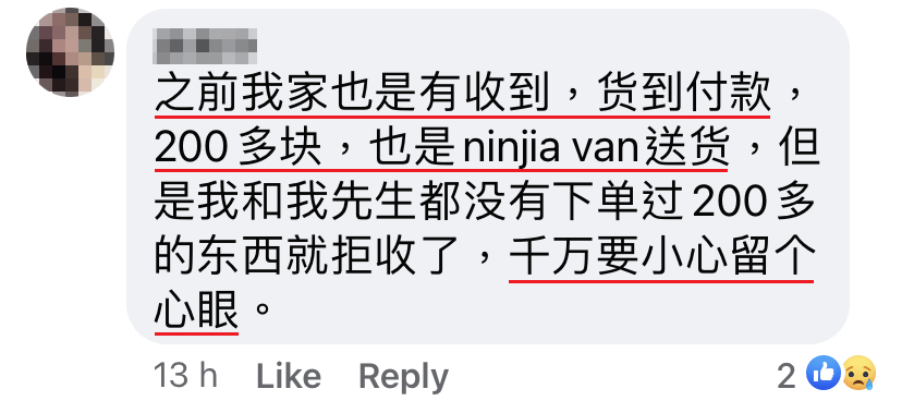 Abang 说他们公司收到的是一整大袋一整大袋的,所以一定还会有很多人会收到,应该不是每一个送货 abang 都会一样,在下着雨还跟我一起研究这个包裹和里面的铁链。提醒身边朋友或家里老人家,别因为一时紧张就去付款签收了。
