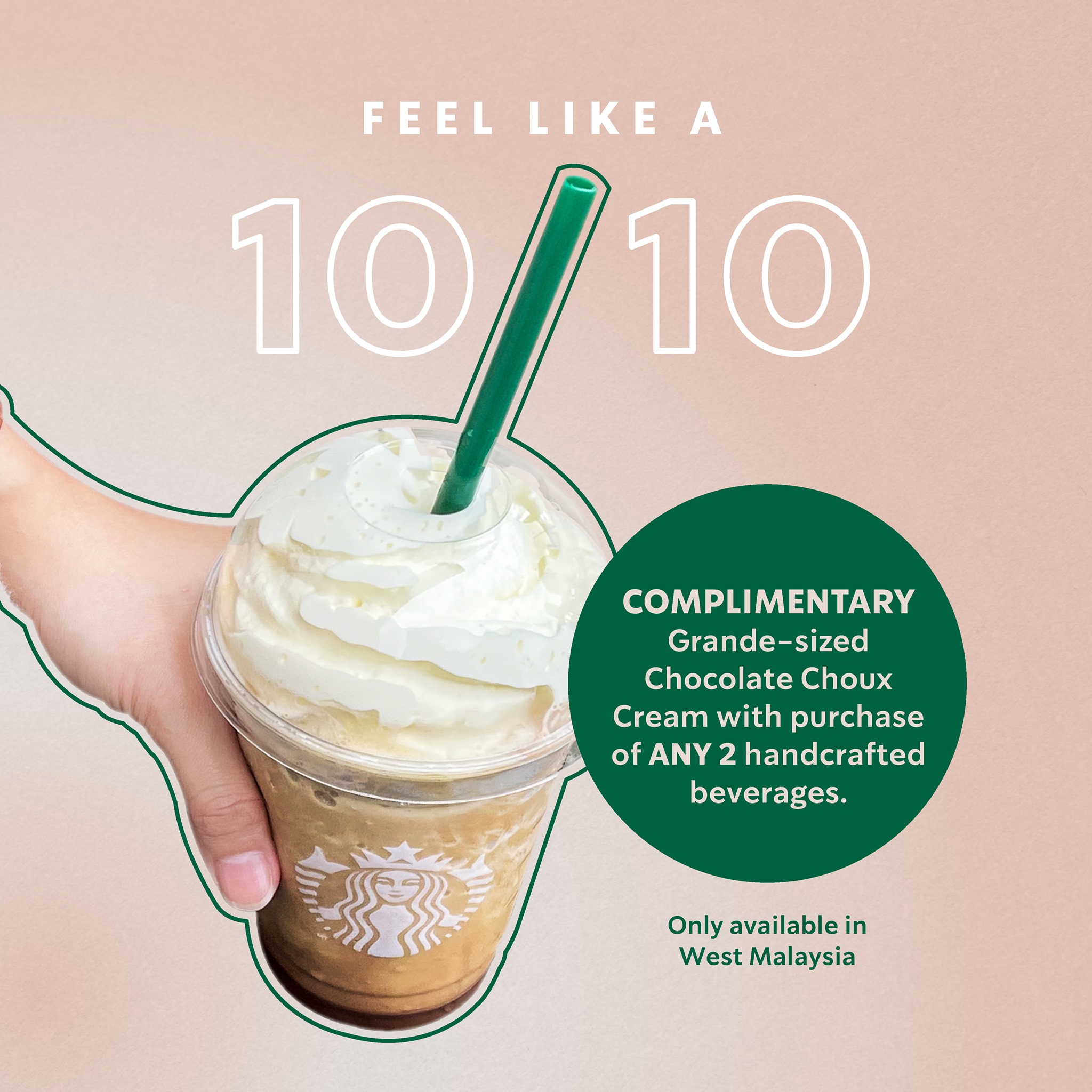 大马Starbucks 将在10月10日免费送出Grande-sized Chocolate Choux Cream 饮料!只要你购买任何2杯饮料,就可免费获得一杯!