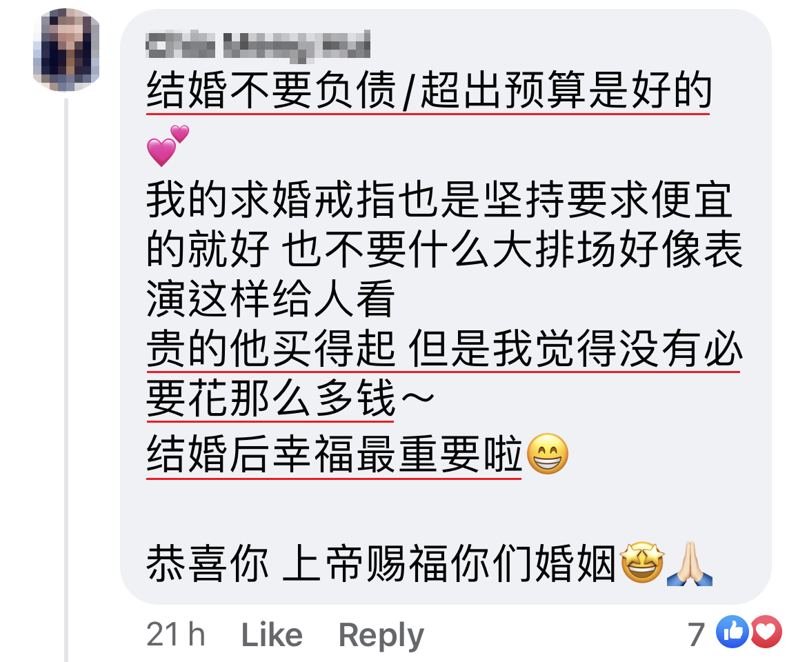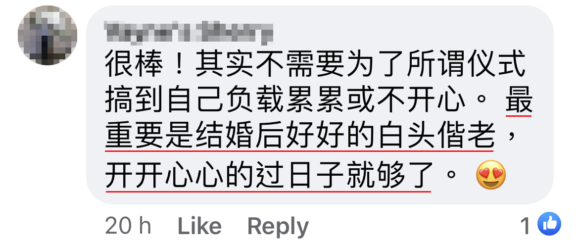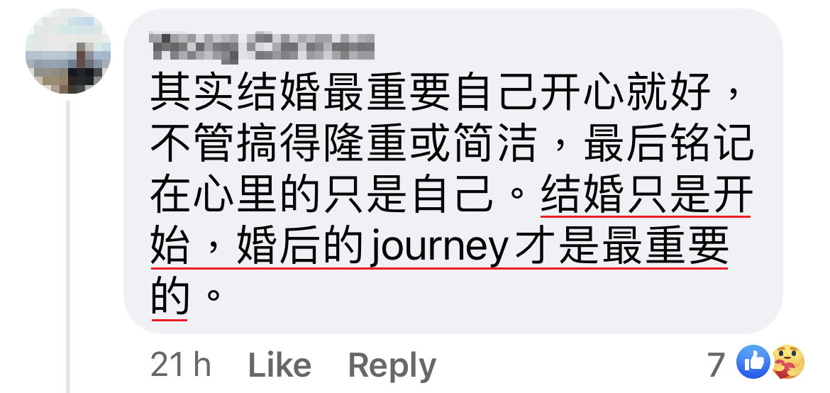早前一名大马女网友曾发文公开自己结婚时所花费的费用,结果遭到酸民们的议论纷纷,近日她在脸书群组“结婚/新人/婚纱/摄影/化妆分享讨论区”分享自己的看法并以此做为回应,三观超正的发言让很多人产生共鸣,不到1天内就累计超过1,000人分享。