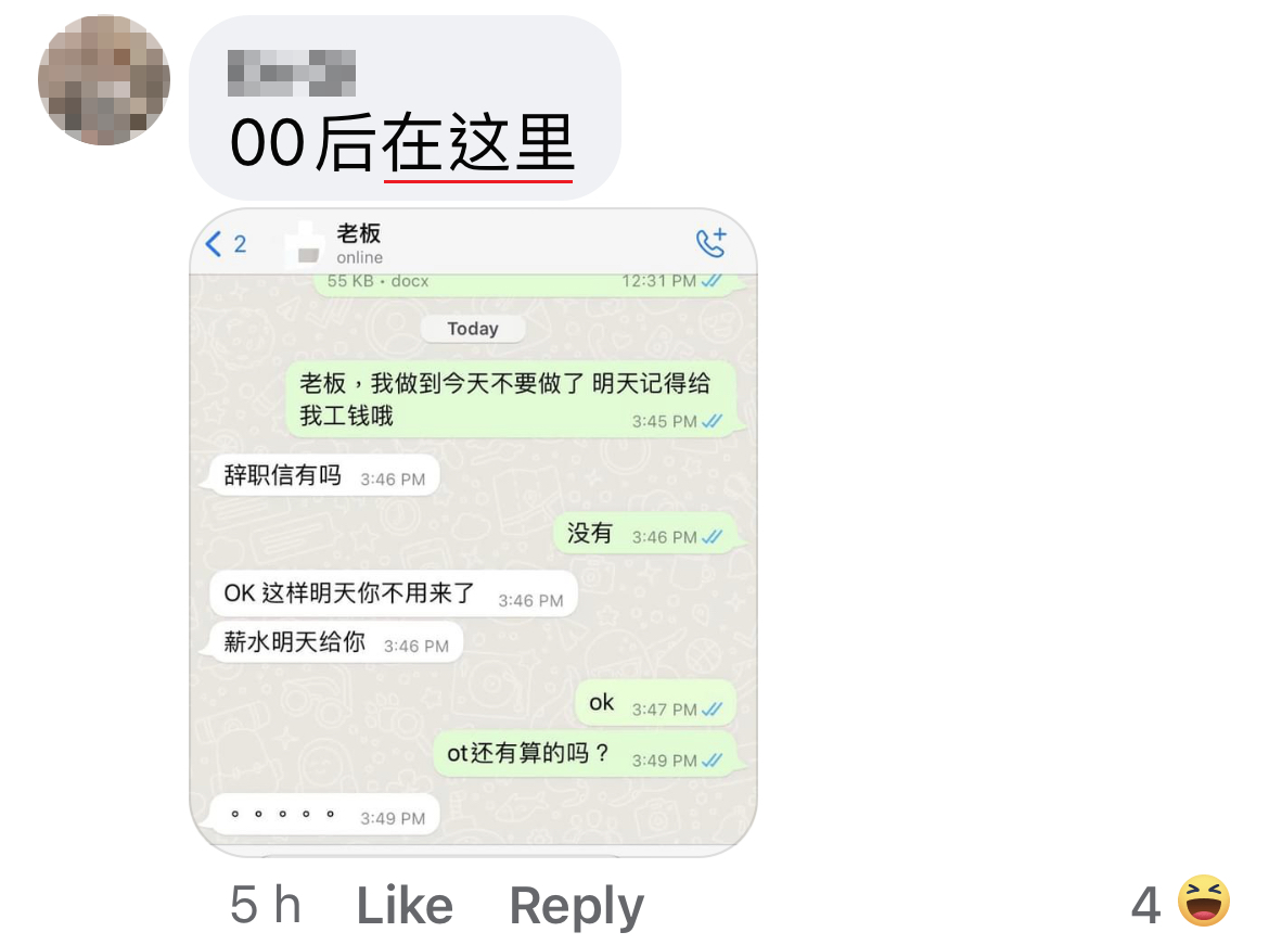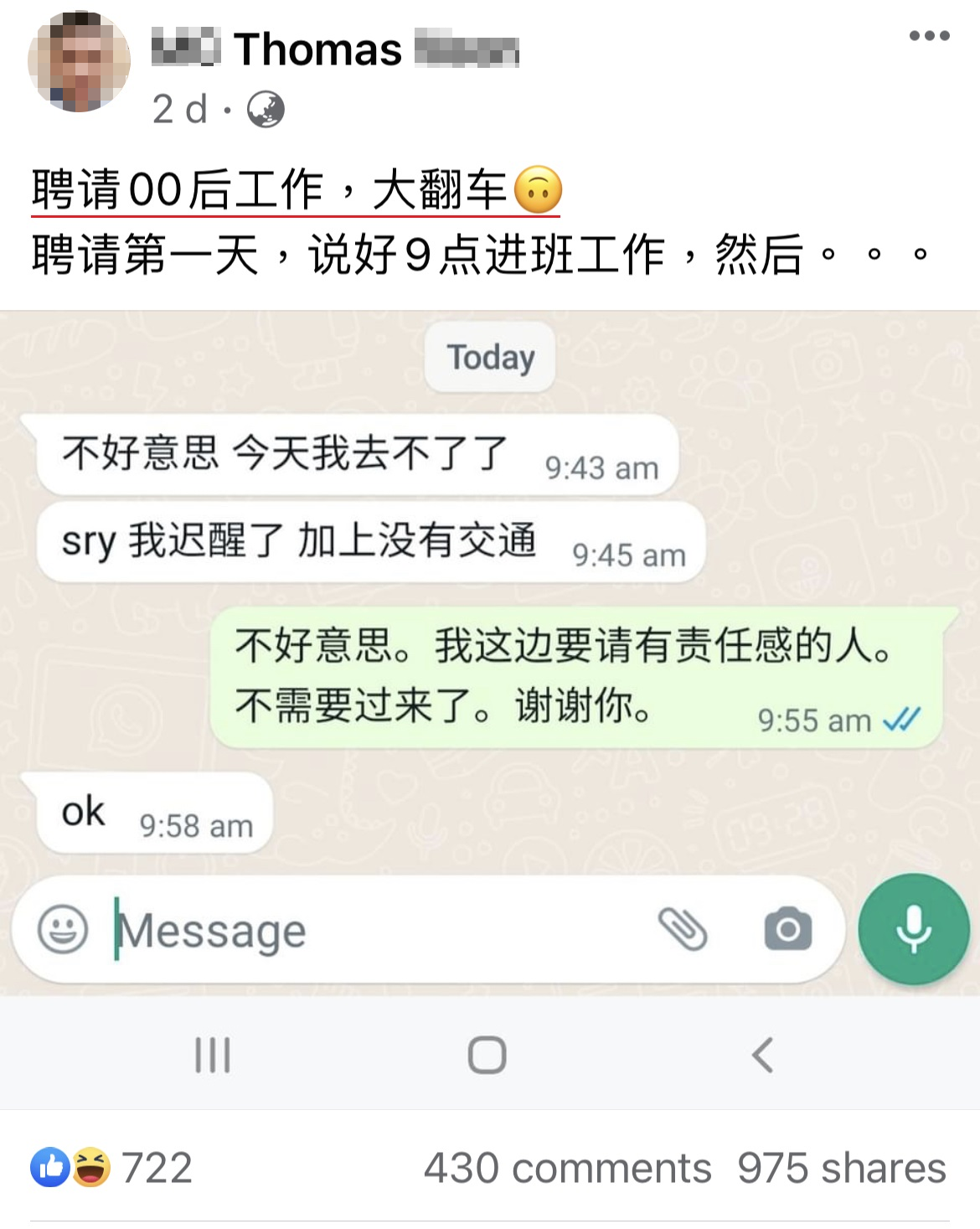 近日一名大马老板在脸书分享一张 WhatsApp 截图,内容是他和一名00后员工的对话。该名员工在上班的第一天就不见人影,原因竟然是他起不了床?!老板感叹:聘请员工大翻车了…